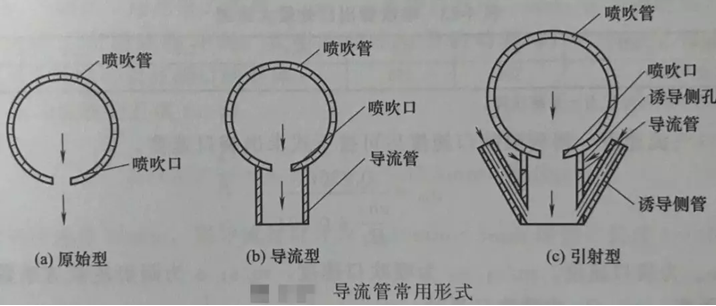 冷吹管上每個噴口下接有一個導(dǎo)流管,可使噴射出的氣流能集中垂直向下。導(dǎo)流管的形狀如下圖所示,其中以C引射型最佳。