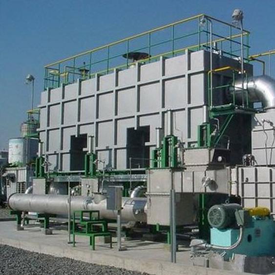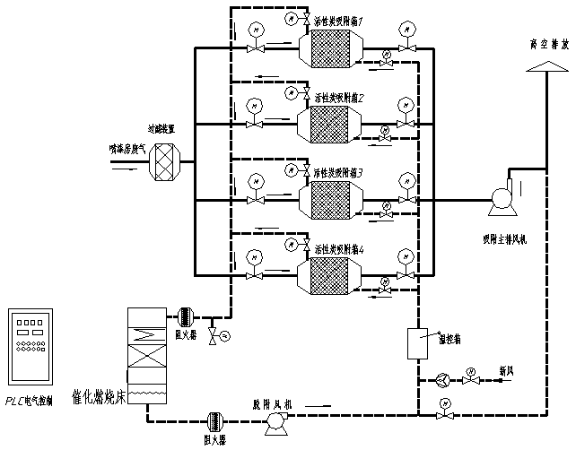 - 系統(tǒng)由4個活性炭吸附箱(3用1備),1個催化燃燒床構(gòu)成,將各條生產(chǎn)線中的所有排氣管合并連接引至凈化設(shè)備,各個支管上安裝一只手動調(diào)節(jié)閥,配比例調(diào)節(jié);廢氣經(jīng)收集匯總后送入集氣箱,再將廢氣送入干式過濾器,干式過濾器能更為精細的祛除廢氣中的粉塵和漆霧,從而避免活性炭微孔被堵塞,延長活性炭的使用周期,活性炭吸附器接近飽和時,系統(tǒng)將自動切換到備用活性炭吸附箱(此時飽和活性炭吸附箱停止吸附操作),然后用熱氣流對飽和活性炭吸附箱進行解吸脫附,將有機物從活性炭上脫附下來。在脫附過程中,有機廢氣已被濃縮,濃度后的濃度較原濃度提高幾十倍,達2000mg/m3以上,濃縮廢氣送到催化燃燒裝置,最后被分解成CO2與H2O排出。完成解吸脫附后,活性炭吸附器進入待用狀態(tài),待其他活性炭吸附箱接近飽和時,系統(tǒng)再自動切換回來,同時對飽和活性炭吸附器進行解吸脫附,如此循環(huán)工作。最后凈化后的潔凈氣體由主排風(fēng)機排入大氣中。
